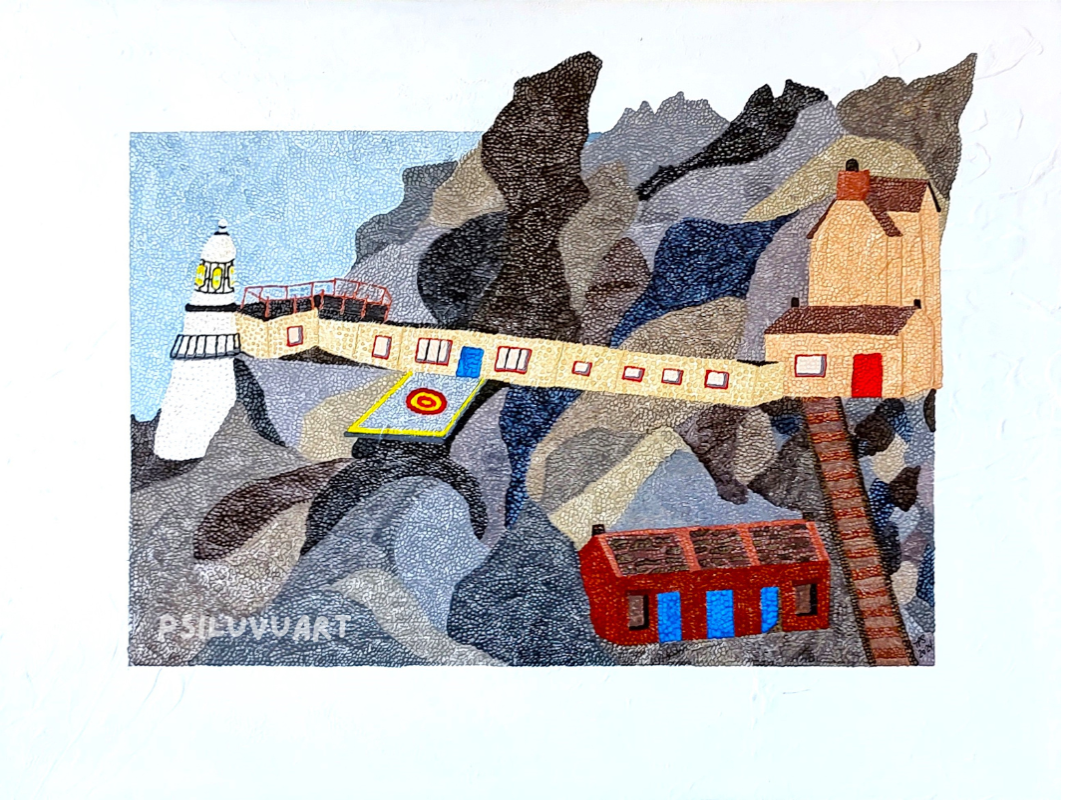 A winding pathway leads from the lighthouse to a charming house perched precariously on the rocks. To the right, a small red structure with blue accents complements the scene, suggesting a sense of community in this remote setting.