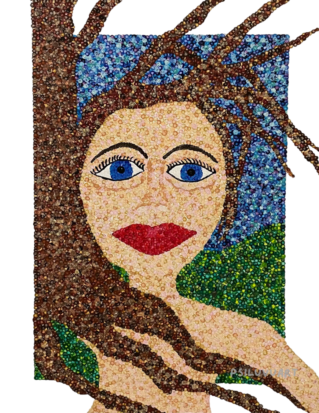 This painting features a stylized female figure with a striking combination of natural and abstract elements. The face is characterized by large, expressive blue eyes and bold red lips. The hair, depicted as the intertwining branches of a large tree merges seamlessly with a textured background of the sky. The use of dots and varied hues creates a mosaic-like effect, adding depth and dimension to the piece.