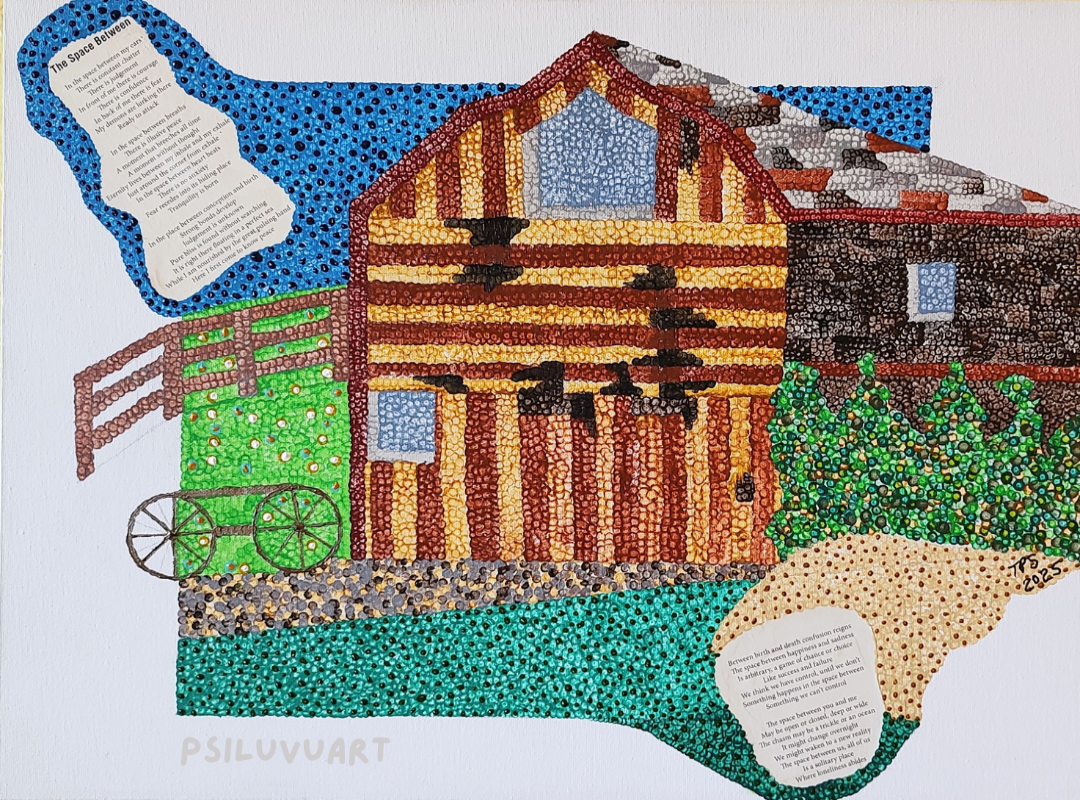 “The Space Between" is a vibrant and textured painting that captures the essence of rural life. The focal point is a rustic barn, its wooden slats painted in warm hues of gold and brown, contrasting beautifully with the cool tones of the surrounding landscape. A weathered cart sits beside the barn and lush greenery emerges from underneath. Poetic texts invite the viewer to reflect on the themes of space, place, connection and the stories held within the landscape.