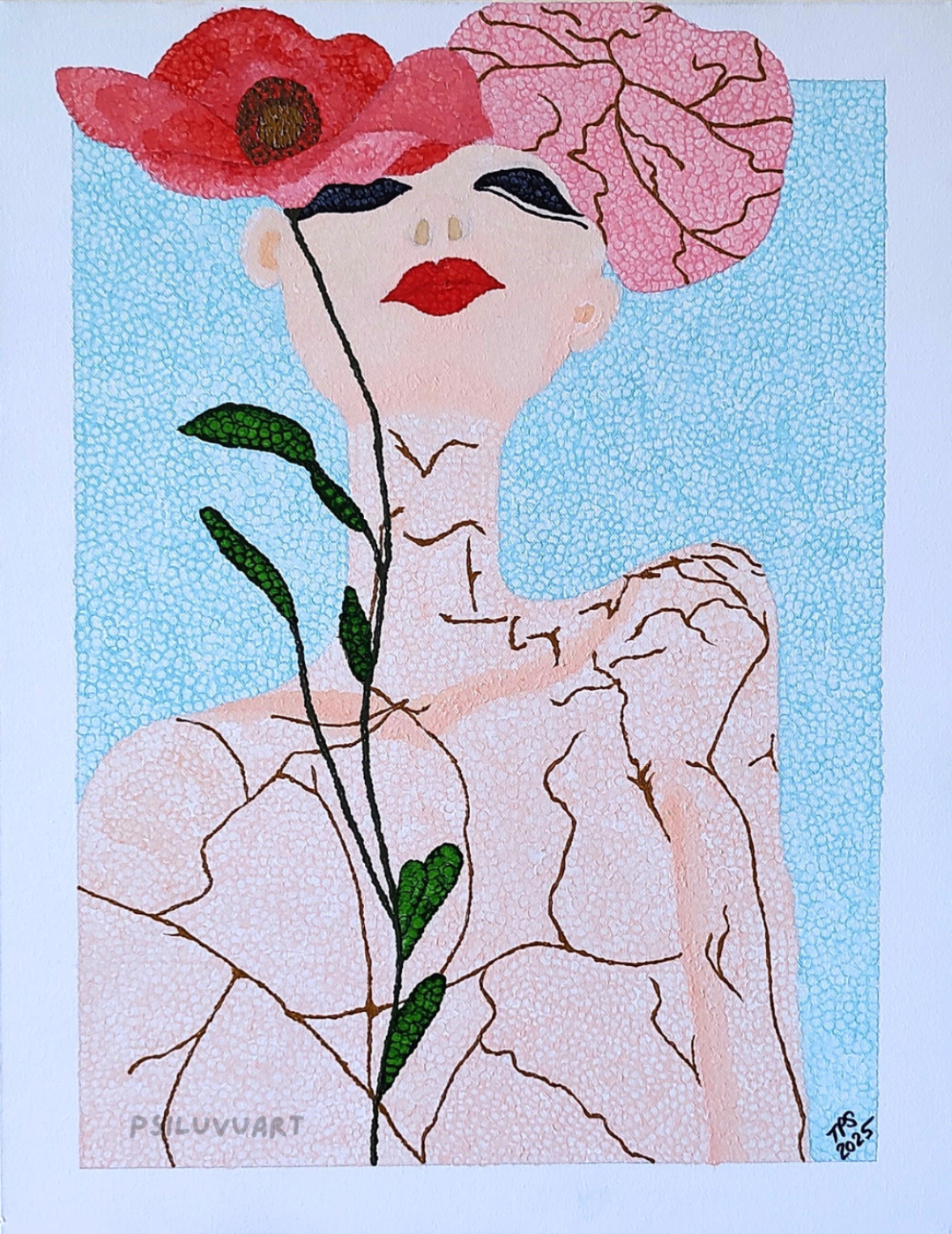 This painting features a woman intertwined with nature. Her skin is textured with fine lines, cracks in her perfectly delicate facade. The poppy that she holds is adjacent to her brain which is outside her head. The image is curious and thought provoking.