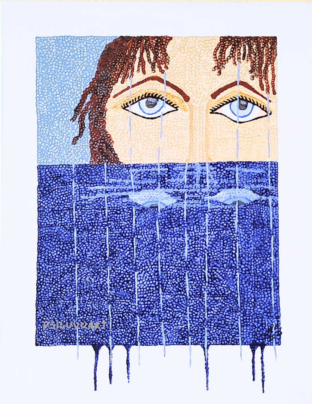 This painting features an interesting division of foreground and background. That merges the sea and sky. The upper section is a background of serene sky-blue and the large face of a female figure with expressive eyes. The lower section is a deep rich blue that picks up the reflection of those expressive eyes. Vertical drips suggest drips from the swimmers wet hair or tears. There is an emotional complexity to this work. Who is she and what is she?
