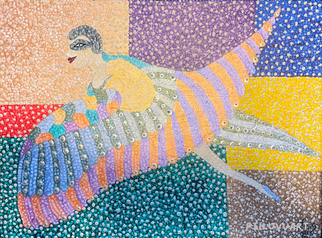 The central character is depicted as a graceful being gracefully gliding through the air like a ballerina. The character's mask adds a mysterious touch, while the striped wings, embellished with shimmering elements, evoke a sense of movement and playfulness. The textured background, composed of various geometric shapes invites viewers to explore the interplay between color and form. This artwork captures a moment of freedom and joy, celebrating the beauty of imagination.