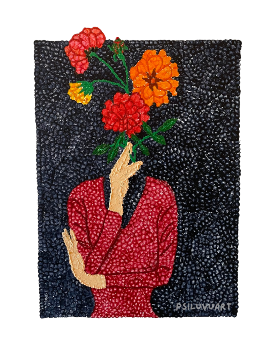 The painting is a striking and imaginative composition that centers on a figure whose head is obscured by a vibrant bouquet of flowers. The figure is dressed in a rich red top and she is posed with her arms elegantly crossed. The black background accents the bursts of color in the painting. She is at one with nature.