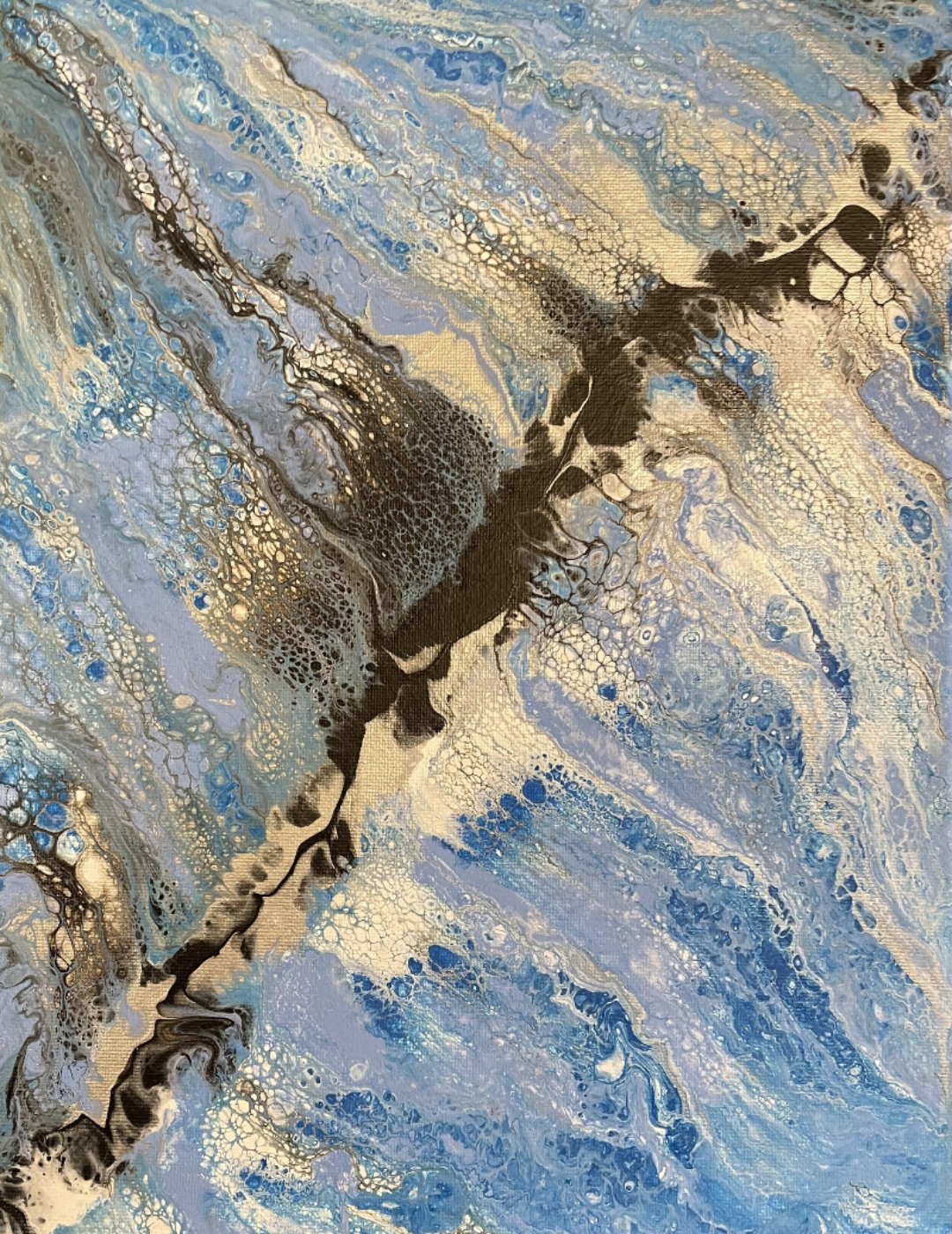 This painting was poured after Hurricane Ian. It features the dynamic nature of water. Swirls of lighter blue blend seamlessly with deeper shades. The accents of sandy beige and rich brown intersperse throughout represent the debris from the storm’s winds. The organic shapes and bubble-like forms suggest the calm after the storm. Riding out a storm is common in Florida because of the length of the peninsula and the fact that there are only 2 ways out, but it leaves us with some jarring memories.
