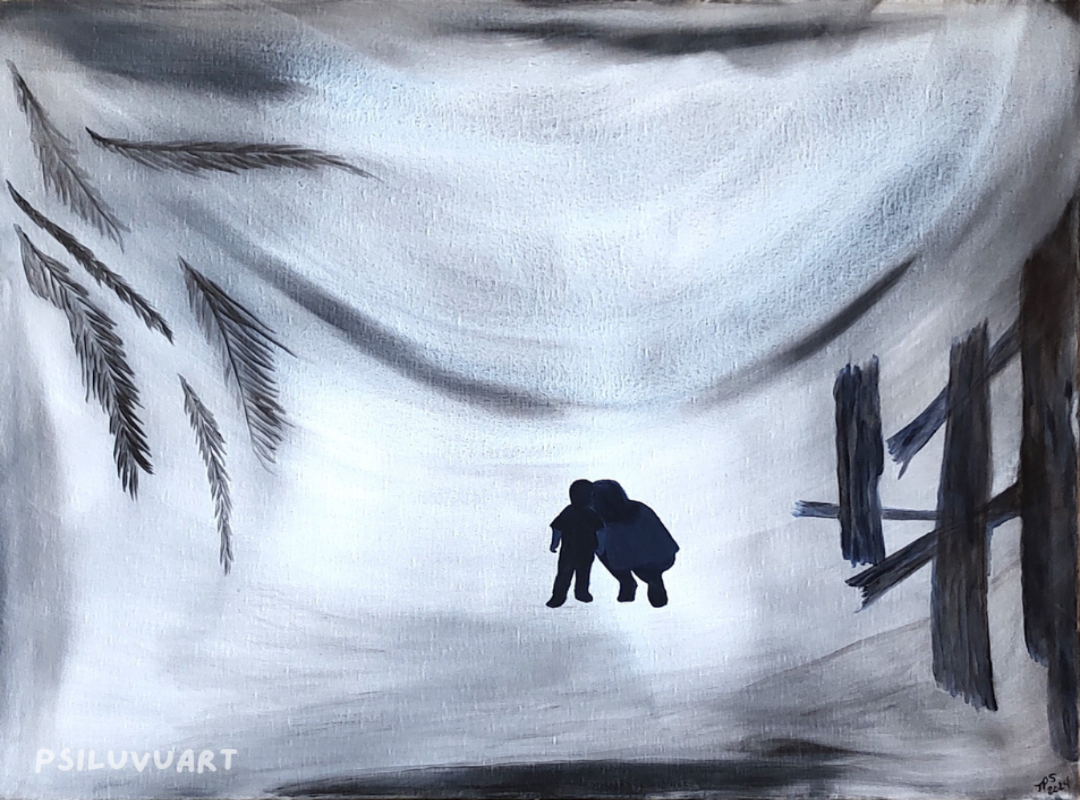 This painting captures an intimate moment in time between mother and child. The monochromatic palette is soothing yet mysterious. The soft background features appear to be mist or clouds in a drape-like fashion. The question might be is the parent showing the way into the future or is she explaining the past.