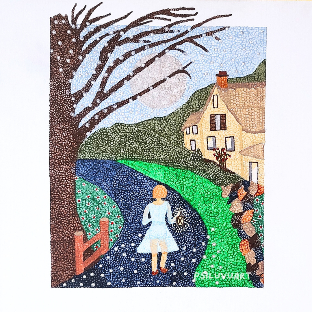 This painting depicts a serene landscape, characterized by a winding path that leads towards a charming house nestled against a backdrop of rolling hills. The scene is framed by a bare tree with intricate branches stretching across the top of the canvas. A woman in a light blue dress walks along the path, holding a light to illuminate her path. A full moon casts a gentle glow over the scene. Is the woman seeking something?