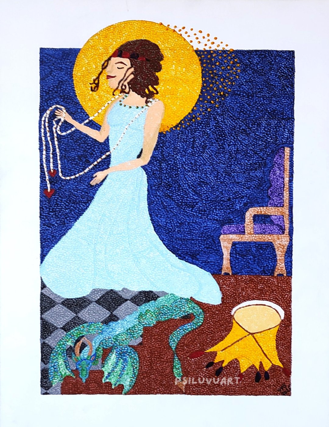 This painting was conceived after reading The Fourth Wing. The central figure is depicted in a moment of contemplation, holding a string of beads that seem to symbolize devotion or prayer. Her long, dark hair cascades elegantly, framed by a radiant golden halo that adds a celestial touch to the composition. The trappings of royalty surround her. A throne and her crown are left behind. But the dragon at her feet remains nearby. She will sacrifice much for love.