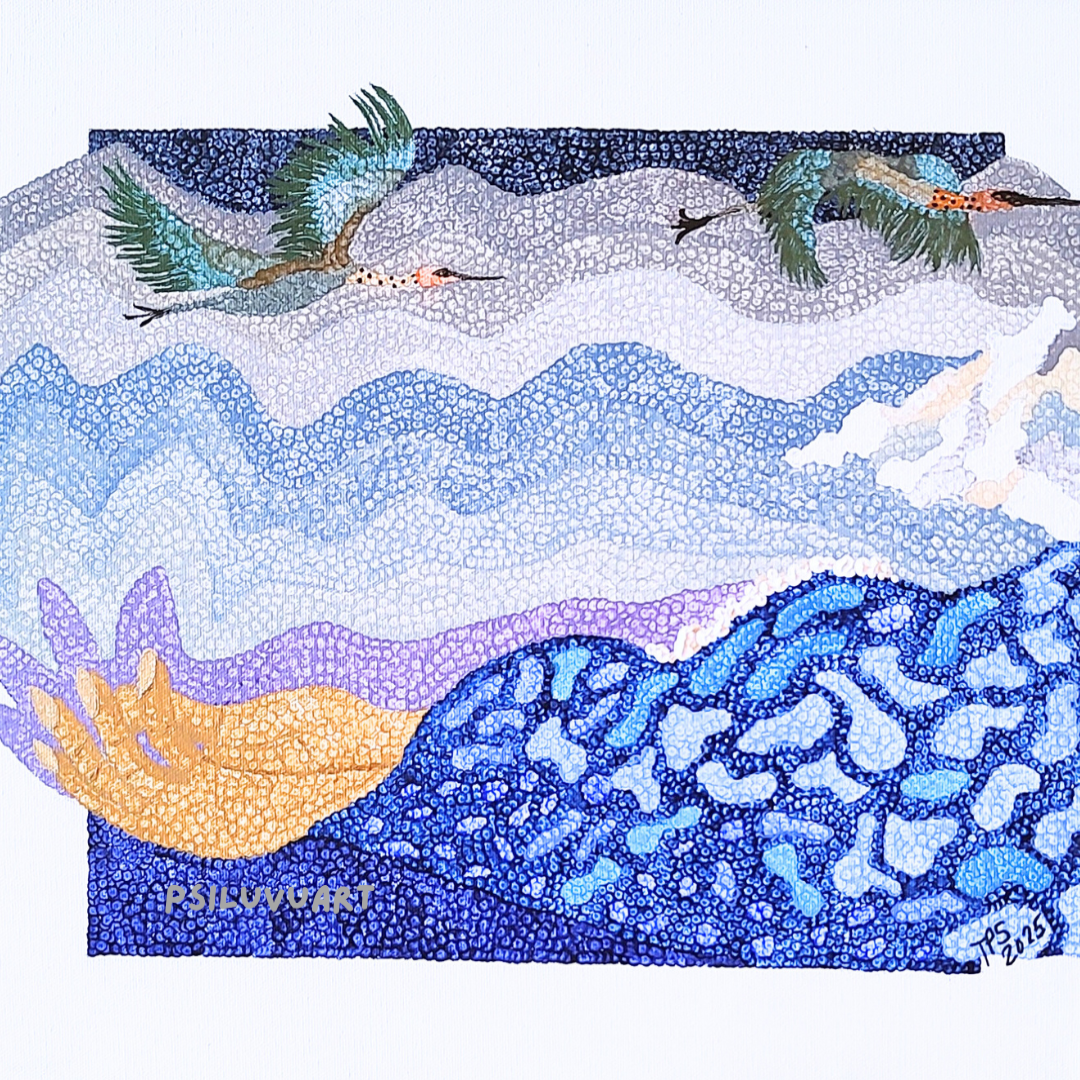 This painting features a gently curved hand emerging from a vibrant wave. The hand seems to move the soft swirling clouds in the background swirling clouds while two delicate birds fly gracefully through the space. The textured patterns throughout the piece, created with meticulous dots, enhance the visual richness of the piece. Maybe you believe we have the power to change the world with our own hands.